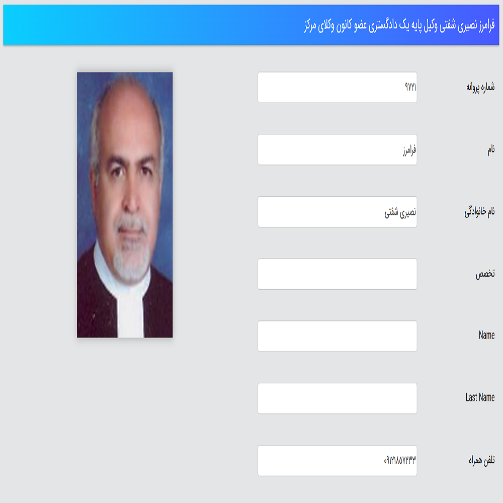 وکیل پایه یک دادگستریوکیل فرامرز نصیری شفتی کیل پایه یک دادگستری می باشند و فارغالتحصیل کارشناسی ارشد در رشته روابط بین الملل از مراکز مطالعات عالی بین المللی دانشگاه تهران هستند. ایشان دارای مدرک D.B.A در رشته مدیریت عالی کسب و کار هستند و دوره های مختلفی را مانند تشخیص اراضی موات، بایر و دایر، حقوق شهری و شهر سازی و … گذراندهاند.