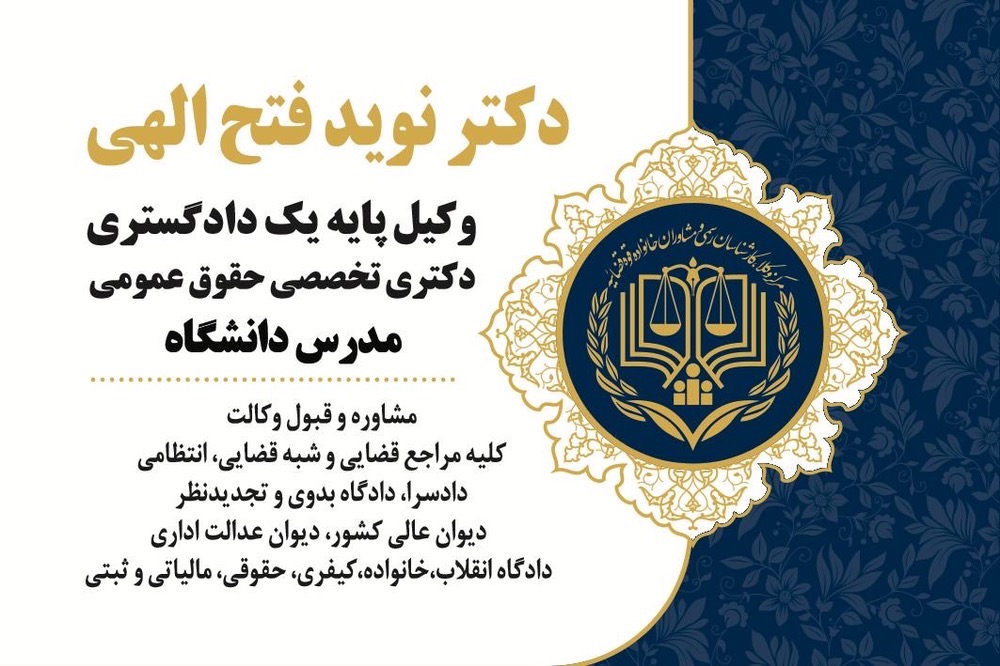 دکتر نوید فتح الهی ،مدرس دانشگاه ،دکتری تخصصی حقوق ، وکیل پایه یک دادگستری ،در عرصه ی وکلای مجرب و متخصصِ بروجرد، با چندین سال تجربه در امر وکالت و حضور و دفاع در جلسات رسیدگیِ متعدد، در زمره ی وکلای توانمندِ شهرستان بروجرد می باشند. ایشان با تسلط کامل بر قوانین و مقررات پیچیده حقوقی، به موکلان خود در حل پیچیدهترین مسائل و ارئه بهترین و سریع ترین راه حل، یاری میرسانند.هم چنین در دفتر وکالت دکتر نوید فتح الهی تیمی متفکر از وکلای پایه یک دادگستری و مشاوران حقوقی با همکاری ایشان، بصورت گروهی پرونده های دادخواهان را مورد بررسی قرار می دهند تا بهترین راه حل را ارائه دهند.