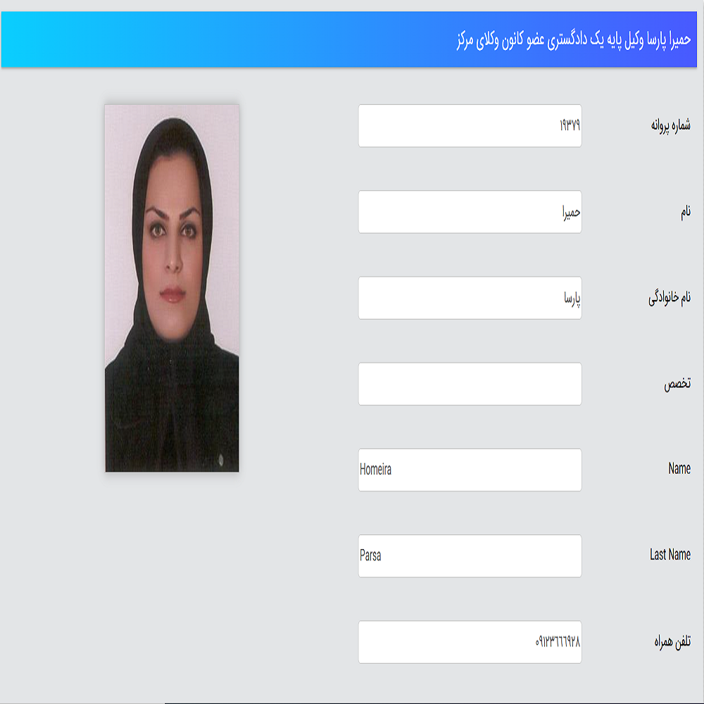 وکیل پایه یک دادگستریحمیرا پارسا وکیل پایه یک دادگستری می باشند و فارغ التحصیل رشته حقوق از دانشگاه تهران هستند. ایشان قادرند در زمینه انواع امور حقوقی و کیفری قبول وکالت کنند.